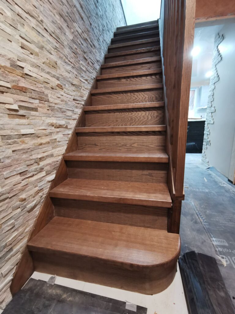 Aside from enhancing aesthetics, staircase cladding also strengthens your stairs. Before installing the new wood cladding, we completely remove the old covering, whether it’s carpet or worn-out materials. This allows us to assess the structure of your staircase and ensure it is sound. At this stage, we carefully measure and cut the cladding pieces to fit the existing risers, ensuring a precise fit precisely.
